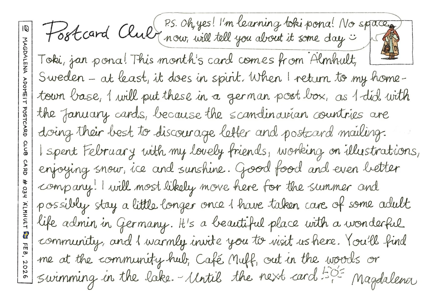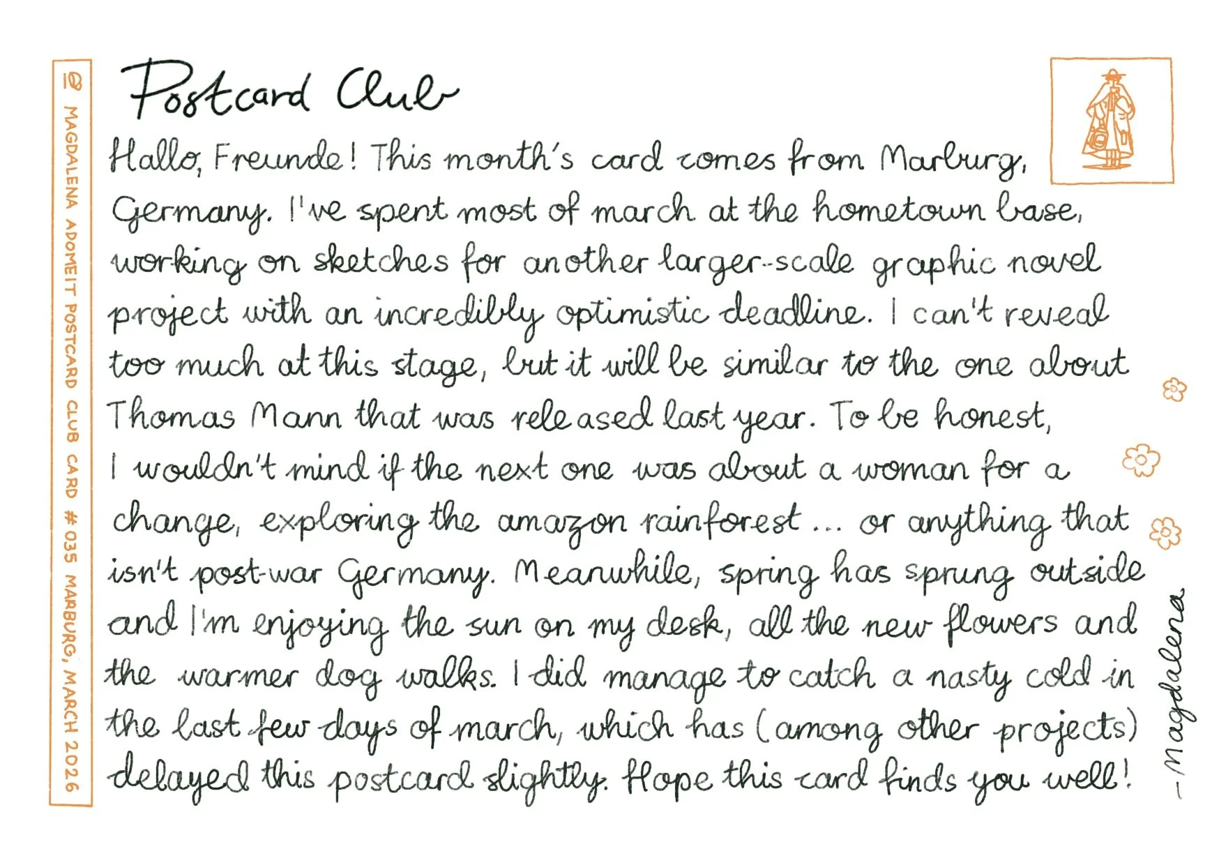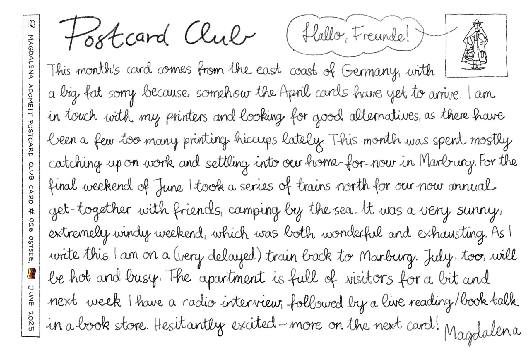 Ps: Postage for letters from Denmark is strangely expensive, so last month's hand-drawn cards are now waiting for our german holiday guests (I clean some holiday apartments on the weekends) to go home and post them for me from over there. I'll have to talk to you about how the Early Supporters tier might need to change in the long term. For now, just know that they're coming, they're just taking a little detour on their way to you.